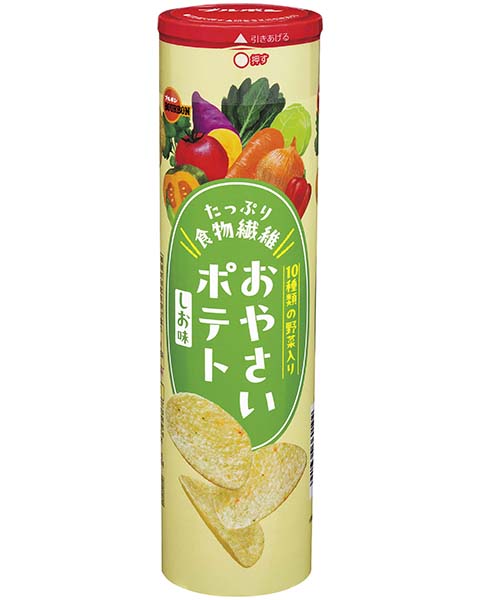 ポテトの生地に10種の野菜を練り込みました。 (たまねぎ、トマト、かぼちゃ、ほうれん草、えんどうまめ、赤ピーマン、にんじん、キャベツ、パセリ、さつまいも) 甘味の強い野菜エキスとカレー粉を隠し味にしたやさしい味付けで、お子様にも食べやすいポテトチップスです。 子供から大人まで幅広くお楽しみいただけるひと品です。 たっぷり食物繊維 10種の野菜入り