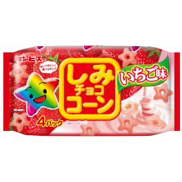 いちごチョコが中までしみ込んだサクサク食感のチョコスナック。 期間限定、いちご味のしみチョココーンです。