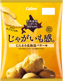 カルビー北海道産じゃがいもを使用した、厚切りポテトチップス。じんわり広がる北海道製造バターの香りとコクが、北海道産じゃがいものおいしさを引き立てます。