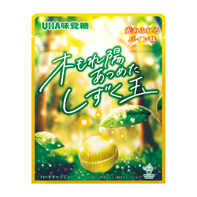 UHA味覚糖木漏れ日が差し込む深い森の中で、太陽の光を浴びて輝く雫をイメージしました。自然の神秘的な美しさを表現したキャンディです。