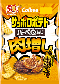 『サッポロポテトバーベQあじ』発売50周年記念の数量限定商品です。いつもの『サッポロポテトバーべQあじ』よりも肉増しの味わい!ビーフ・チキン・ポークで肉の旨みを感じる味わいです。