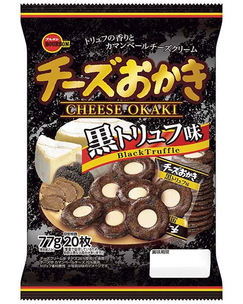 黒トリュフと黒こしょうで味付けしたおかき生地で、濃厚なカマンベールチーズクリームをサンドしました。