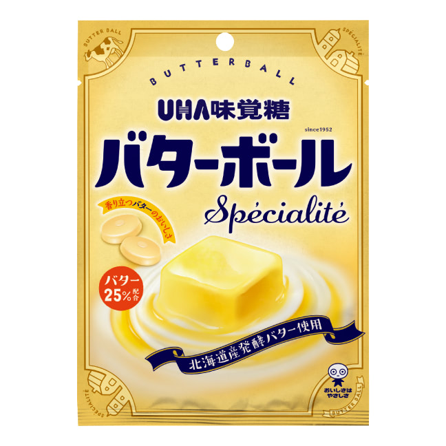 UHA味覚糖バターのおいしさにこだわり、キャンディの1/4にバターを使用しました。発酵バターの特徴であるほのかな酸味とコク深い風味をしっかりお楽しみいただけます。