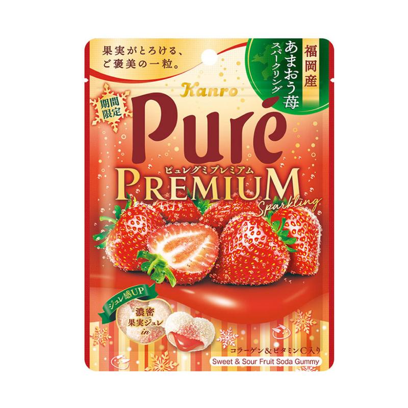 水飴(国内製造)、砂糖、ゼラチン、濃縮いちご果汁/酸味料、増粘剤(ペクチン)、炭酸カルシウム、ゲル化剤(ペクチン:りんご由来)、ビタミンC、香料、着色料(ブドウ色素、トマト色素)