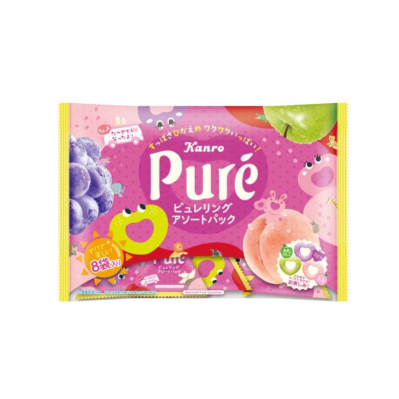 砂糖(国内製造)、水飴、ゼラチン、濃縮果汁(ぶどう、りんご、もも)/酸味料、増粘剤(ペクチン)、炭酸カルシウム、着色料(アントシアニン、紅花黄、クチナシ)、香料、塩化カリウム