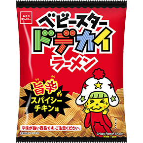 ベビースタードデカイラーメン(旨辛スパイシーチキン味) おやつカンパニー 2024.11.13 カリッとクリスピー!旨さと辛さにこだわったスパイシーチキン味 販売先/発売日 スーバーマーケット/販売中 販売地域 全国 内容量 62g 栄養成分表示(1袋62g当たり 熱量331kcal たんぱく質4.7g 脂質18.7g 炭水化物36.1g 食塩相当量1.89g アレルギー一覧 小麦・卵・大豆・鶏肉・豚肉・ゼラチン
