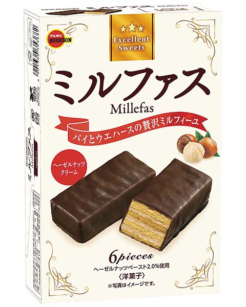香り高いヘーゼルナッツクリームをサクサク食感のパイとウエハースでサンドし、 少しビターなチョコレートを贅沢にオールコーティングしました。 パイとウエハースの贅沢ミルフィーユ