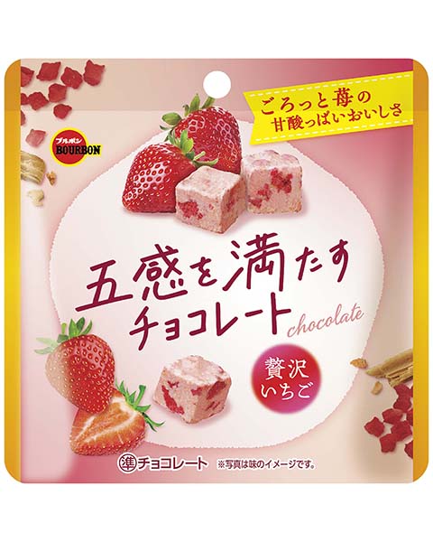 甘酸っぱいフリーズドライ苺と軽い食感のフィアンティーヌを練り込んだ、ひとくちサイズのチョコレートです。 手につきにくく、利便性に優れたパウチ形態商品です。 ごろっと苺の甘酸っぱいおいしさ