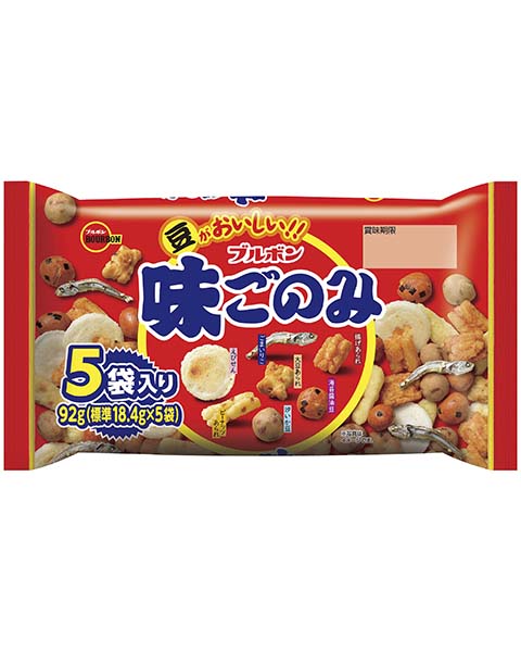 でん粉(国内製造)、落花生、植物油脂、砂糖、コーンフラワー、小麦粉、うるち米粉(国産)、しょうゆ(小麦・大豆を含む)、かたくちいわし、もち米粉(タイ産)、食塩、寒梅粉(もち米(タイ産))、水飴、大豆、デキストリン、食用加工油脂、糖蜜、えび粉、発酵調味料、刻みいか、ごま、海苔、香味油(小麦・えび・大豆を含む)、ぶどう糖果糖液糖、たんぱく加水分解物(大豆を含む)、酵母エキス粉末、粉末しょうゆ(小麦・大豆を含む)、唐辛子粉末、昆布粉、えびシーズニング(大豆を含む)、青のり粉、かつお風味調味料(乳成分を含む)、にんにく粉末/加工デンプン、ソルビトール、トレハロース、乳化剤(大豆由来)、着色料(カロテノイド、カラメル)、膨脹剤、調味料(アミノ酸等)、香料(えび由来)、セルロース、酸化防止剤(V.E、V.C)、微粒酸化ケイ素、香辛料抽出物