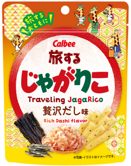 旅するじゃがりこ 贅沢だし味 カルビー 2024.11.20 旅するじゃがりこ 贅沢だし味 全国の代表的なだしの味をひとくちで味わえるような、かつおだし、昆布だし、隠し味に焼きあご(とびうお)だしを加えたこだわりの3種のだし味です。 その他じゃがりこ ブランドサイトへ NET 38g 賞味期限 6ヶ月 原材料名 じゃがいも(国産)、植物油、乾燥じゃがいも、ミルクパウダー、粉末植物油脂、食塩、かつお削りぶし、でん粉、こんぶエキスパウダー、かつおぶしエキスパウダー、たん白加水分解物(大豆を含む)、砂糖、かつおぶしパウダー、酵母エキスパウダー、こんぶパウダー、焼きあごパウダー / 調味料(アミノ酸等)、乳化剤、酸化防止剤(V.E、V.C、チャ抽出物)、甘味料(ステビア)、香料 栄養成分表示 エネルギー:189kcal、たんぱく質:2.7g、脂質:9.1g、炭水化物:24.0g、食塩相当量:0.7g アレルギー一覧 乳成分 大豆