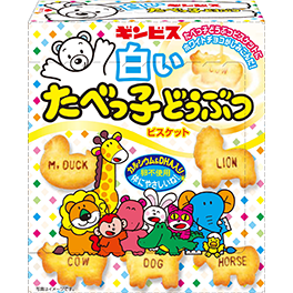 - ロングセラーのたべっ子どうぶつにホワイトチョコをしみ込ませました。